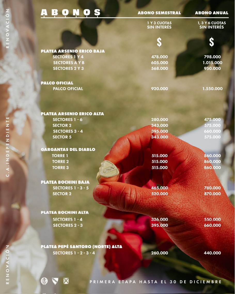 Independiente lanzó la primera etapa de renovación y venta de los abonos a platea, para el próximo año. La misma comenzó en el día de hoy, y dura hasta el 30 del corriente.