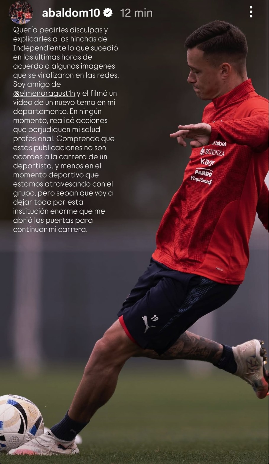 Hace unos minutos, el jugador realizó un descargo en redes, explicando la situación. En el posteo, Abaldo argumenta que todo fue en el marco de un video de su amigo cantante, realizado en su departamento.