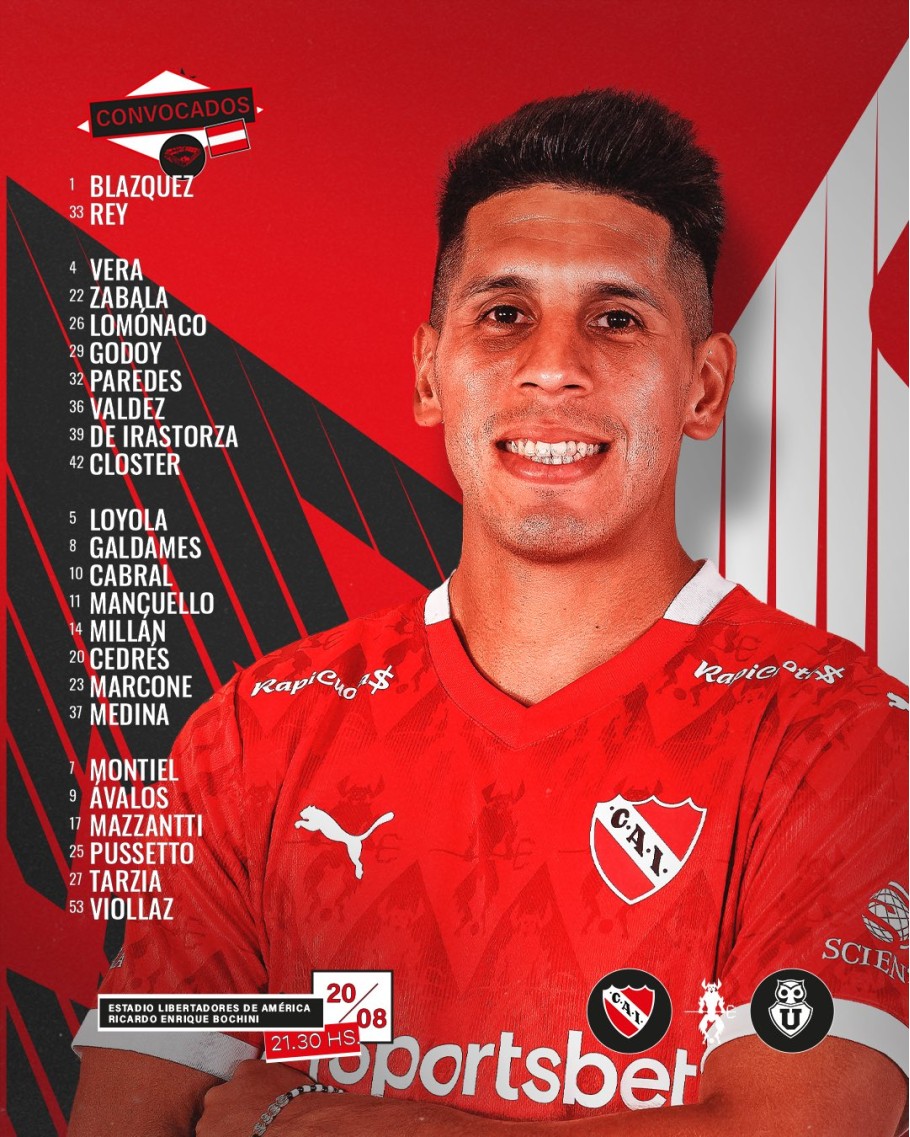 Independiente dio a conocer la lista de convocados para el partido de este martes ante Universidad de Chile, por la vuelta de los octavos de final de la Copa Sudamericana, que se jugará en el estadio Libertadores de América - Ricardo Enrique Bochini desde las 21:30.